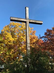 Unsere Kirche wirkt von außen wie von innen eher unscheinbar. Außen zeigt ein schlichtes Holzkreuz an, dass sich hier katholische Christen zu Gottesdiensten, aber auch zu Gesprächen und Feiern zusammenfinden. Der schlichte Raum innen erhält seine Gestalt durch die Glasfenster. Das große runde Fenster über dem Altar symbolisiert die Dreifaltigkeit (Vater, Sohn und Hl. Geist). Das Kreuz wirft sein helles Licht genau auf die Stelle des Altars, wo das Gedächtnismahl des Sterbens und der Auferstehung Jesu gefeiert wird.